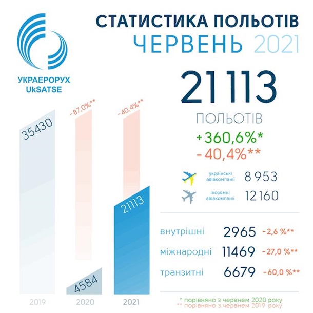 В свою очередь украинские авиакомпании в июне 2021 года выполнили 8953 полета (на 20% меньше июня 2019 года), иностранные авиакомпании выполнили 12160 полетов (меньше на 49,8%).
