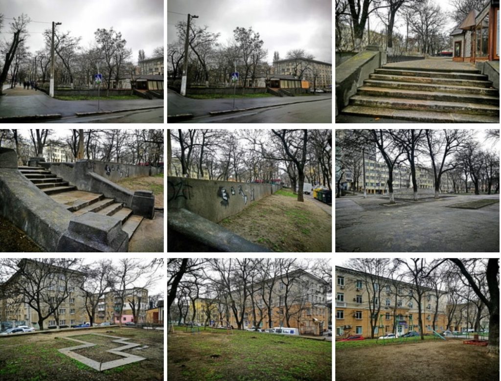 Площадь сквера — чуть менее половины гектара, а если точнее — то 45,0 соток. По проекту площадь благоустройства составляет 63,8 сотки. Как показало обследование, в сквере необходимо отремонтировать существующие подпорные стены и парапеты. Также здесь стоит очень убогая и изношенная детская площадка. А с двух сторон сквера находятся два кафе в небольших некапитальных строениях.