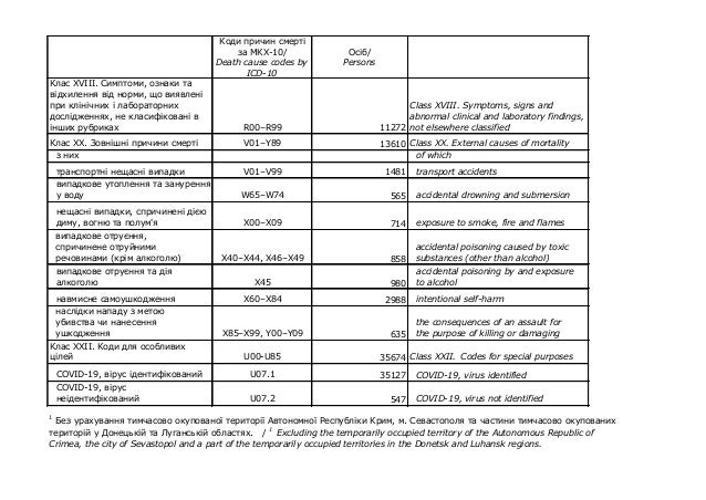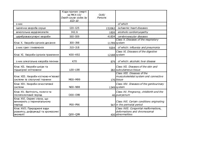 Кроме того, 13610 украинцев погибли в результате внешних причин. Среди них транспортные несчастные случаи стали причиной смерти 1481 граждан, утопление — 565, гибель на пожаре — 714, случайное отравление (кроме алкоголя) — 858, отравление алкоголем -980, самоубийства — 2988, умышленные убийства — 635.