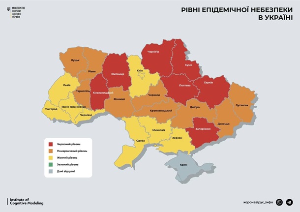 «Красными» остаются Житомирская, Запорожская, Полтавская, Сумская, Харьковская, Хмельницкая и Черниговская области.
