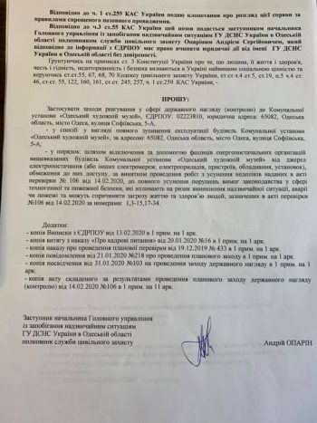 Руководство Художественного музея получило повестку от ГСЧС с ходатайством о закрытии заведения. Об этом на своей странице в социальной сети сообщила заместитель директора музея, Александра Ковальчук.