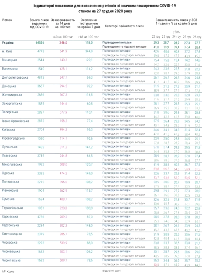 По состоянию на утро воскресенья, 27 декабря, в Украине заполнены 38,4% от общего количества больничных коек, которые были выделены для зараженных коронавирусом. Всего на эти потребности было выделено 64 526 таких кроватей. Об этом свидетельствуют данные, размещенные на сайте Министерства здравоохранения, передает «Страна».