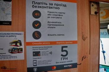 В каждом из вагонов, обслуживающих маршрут, установлено по одному терминалу в рамках партнерского соглашения между КП «Одесгорэлектротранс», банком «Восток» и системы «Mastercard».