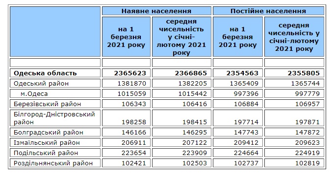 На начало марта 2021 года численность населения Одесской области составила 2,365 млн человек, что на десять тысяч меньше в сравнении с аналогичным периодом прошлого года. Об этом свидетельствуют данные Главного управления статистики в Одесской области, передает «Топор».