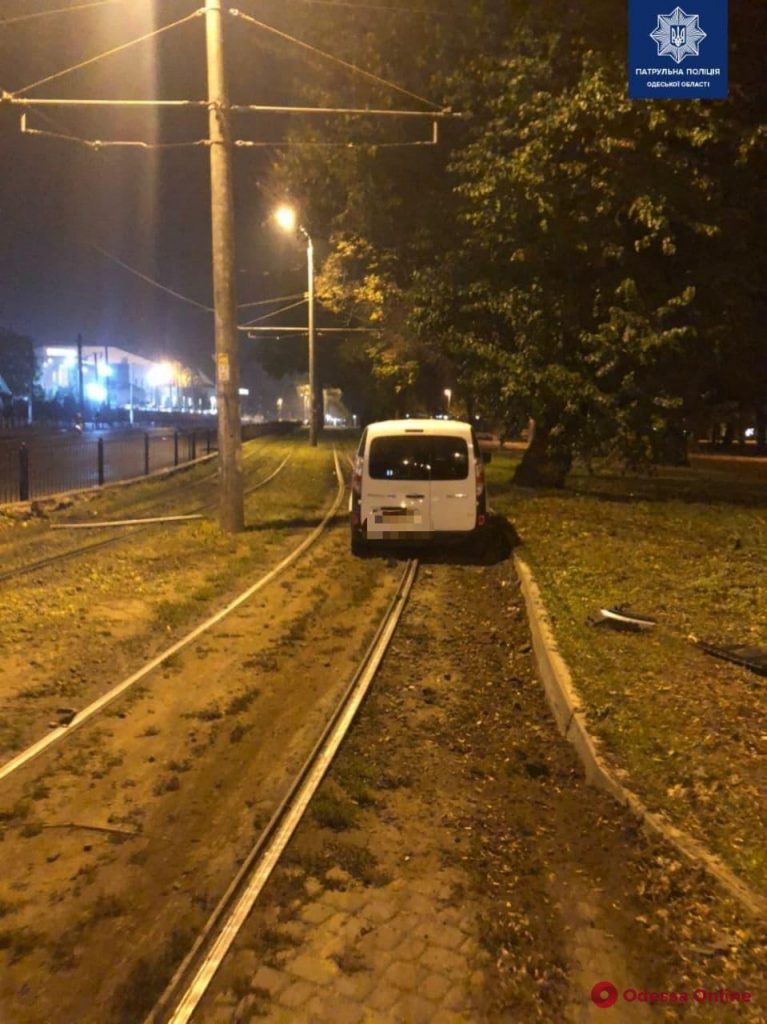 Водитель автомобиля Renault не выбрал безопасную скорость, в результате чего машина сбила дорожный знак и вылетела на трамвайные пути. Водитель пытался уехать с места происшествия, но инспекторы патрульной полиции его задержали.