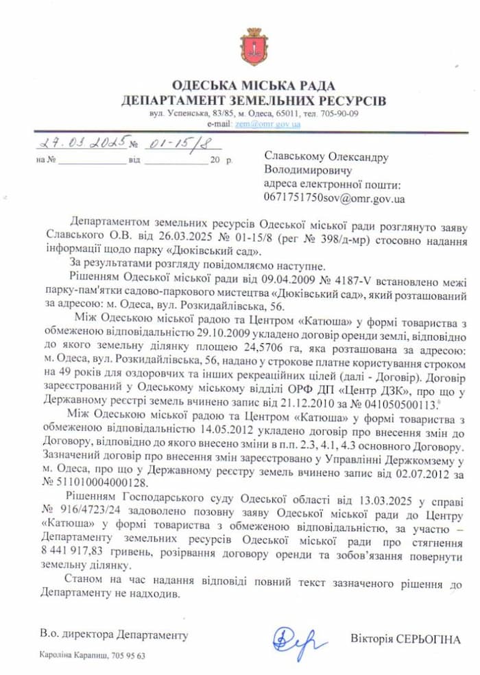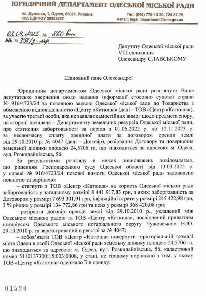 Об этом сообщил депутат Одесского горсовета Александр Славский, ссылаясь на ответ земельного и юридического департаментов.