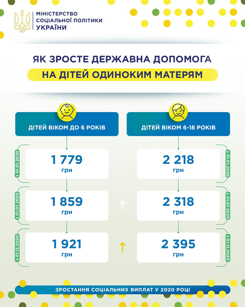 Отмечается, что государственная помощь на детей одиноким матерям на ребенка до 6 лет с 1 января 2020 года составит 1779 грн, с 1 июля 2020 года — 1 859 грн, а с 1 декабря 2020 года — 1921 грн.