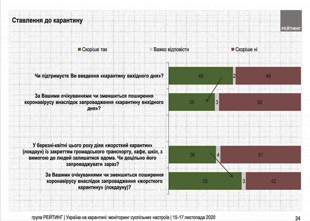 При этом 61% считают нецелесообразным введение локдауна, а 36% поддерживают. При этом больше половины украинцев эффективность локдауна оценивают выше, нежели просто карантин в субботу и воскресенье. 55% считают, что распространение коронавируса в результате локдауна уменьшится, 42% — имеют противоположное мнение.