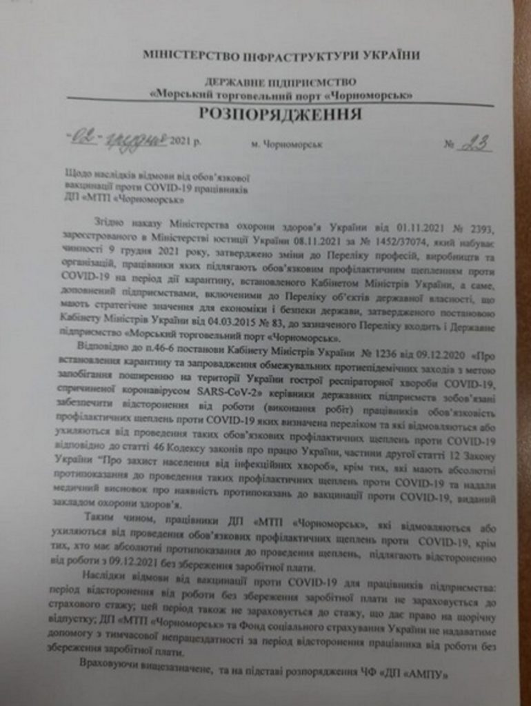 Соответствующие распоряжения на отстранение выдало руководство портов Черноморска, Измаила и Бердянска. В частности, 9 декабря работники ГП «Изимальский МТП» получили выписки из приказа. Остальные работники, график которых является посменным, будут уведомлены об отстранении в день их рабочей смены. Сейчас неизвестно количество работников во всех портах, которые собираются отстранить из-за отсутствия вакцинации.