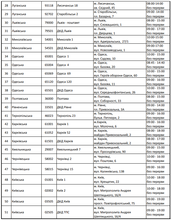 Список отделений Укрпочты, предоставляющих услуги на Пасху, 2 мая