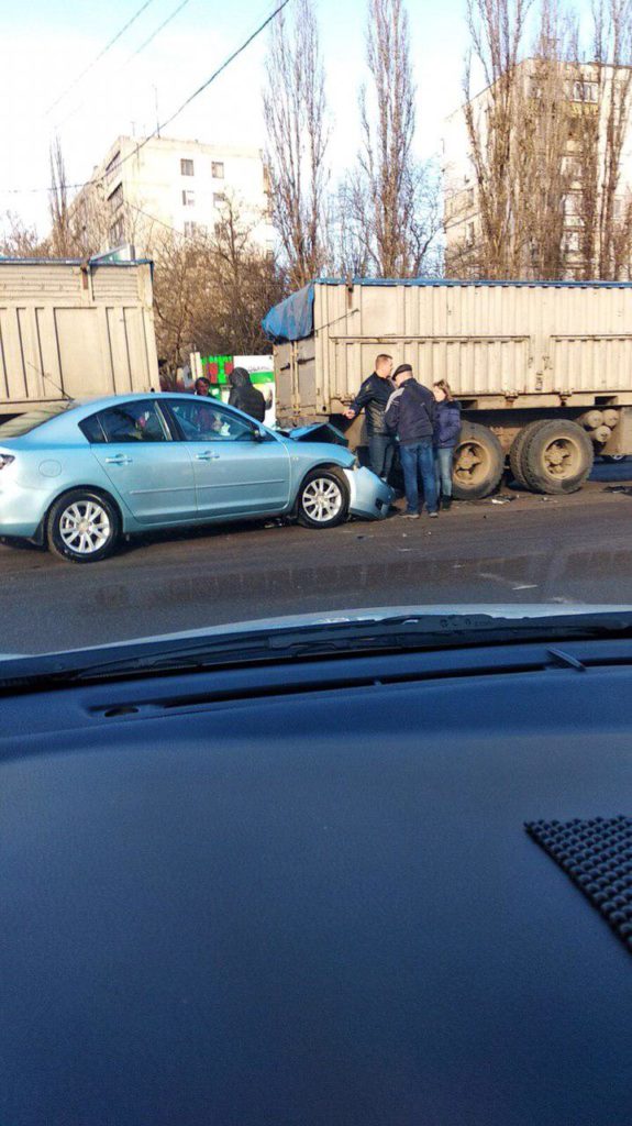 На пересечении проспекта Добровольского и улицы Генерала Бочарова автомобиль Mazda 3 врезался в фуру. По данной аварии данных о пострадавших нет.