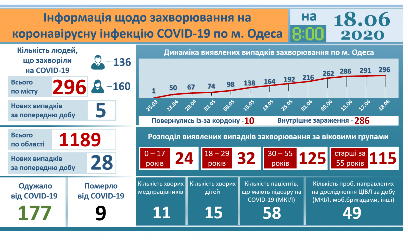 По информации Одесского областного лабораторного центра МОЗ Украины, на утро 18 июня 2020 года в Одесской области лабораторно подтверждены 1189 случаев COVID-19. Из них 296 человек — жители Одессы. За последние сутки в регионе зарегистрированы 28 новых случаев заболевания, из них пять — у одесситов, 23 — у жителей районов области, передает пресс-служба мэрии.