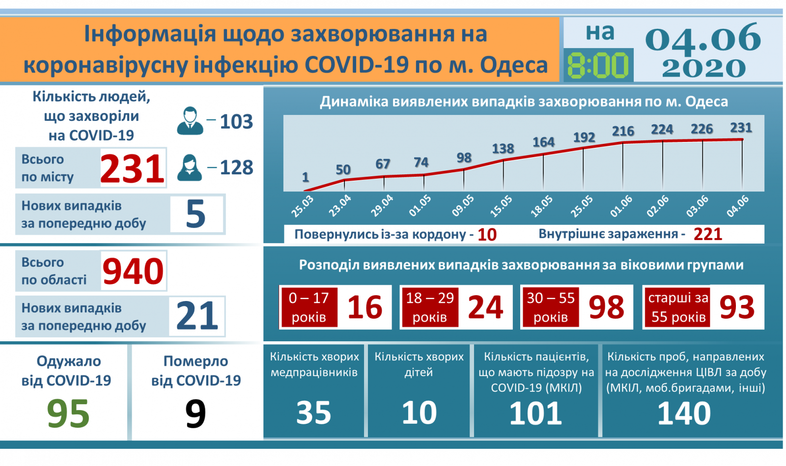 По информации Одесского областного лабораторного центра МОЗ Украины, на утро 4 июня 2020 года в Одесской области лабораторно подтверждены 940 случаев COVID-19. Из них 231 человек — жители Одессы. За последние сутки в регионе зарегистрирован 21 новый случай заболевания, из них 5 — у одесситов, 16 — у жителей районов области, передает пресс-служба мэрии.