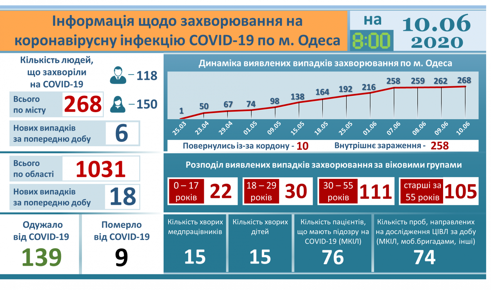 По информации Одесского областного лабораторного центра МОЗ Украины, на утро 10 июня 2020 года в Одесской области лабораторно подтвержден 1031 случай COVID-19. Из них 268 человек — жители Одессы. За последние сутки в регионе зарегистрированы 18 новых случаев заболевания, из них шесть — у одесситов, 12 — у жителей районов области, передает пресс-служба мэрии.