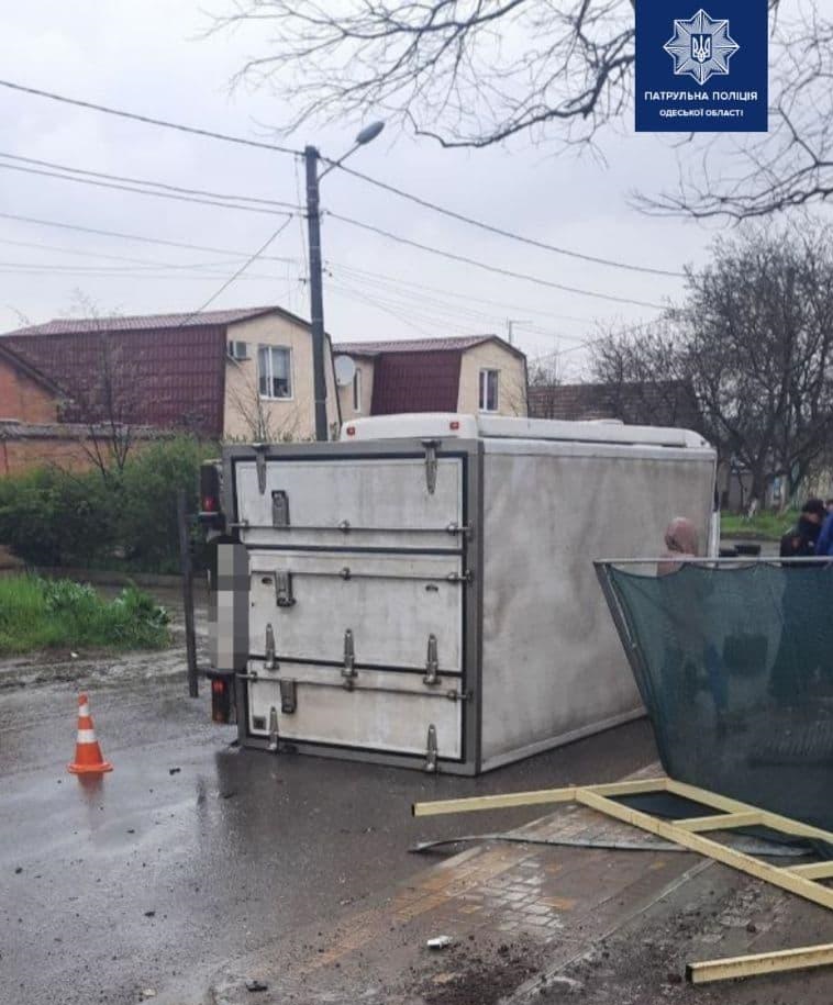 Сегодня утром, 25 апреля, на улице Неждановой водитель грузового автомобиля Mercedes не справился с управлением, выехал за пределы проезжей части, снес дорожный знак, врезался в киоск, после чего автомобиль опрокинулся на бок, сообщает пресс-служба патрульной полиции Одесской области.