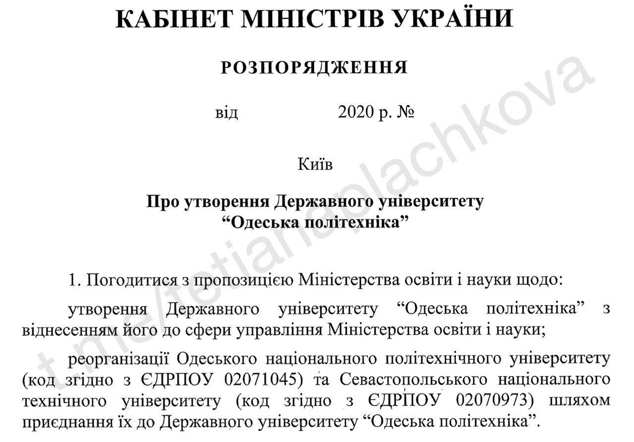 В результате реорганизации политех присоединяют к создающемуся Государственному университету «Одесская политехника». В состав новообразования войдет так же Севастопольский политех, который и по сей день юридически находится в Севастополе. Об этом сообщила на своем телеграмм-канале нардеп Татьяна Плачкова.