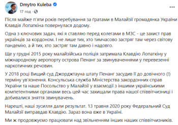“Наконец, наши усилия дали результат. 13 мая 2020 Федеральный Суд Малайзии оправдал Клавдию. Сейчас она уже в Украине. Мы продолжаем работать над освобождением других наших соотечественников”, – написал министр.