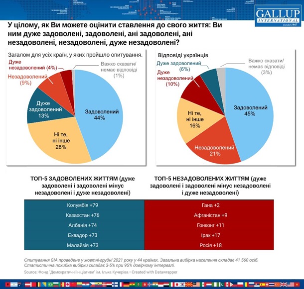 Отметим, что международный опрос ассоциацией Gallup с октября по декабрь 2021 года. Выборочная совокупность составляет 41 560 респондентов из 44 стран мира. В Украине с 2 по 11 декабря 2021 года опросили 2003 респондентов.