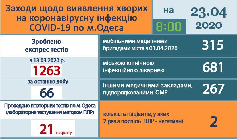 По данным на 23 апреля, зарегистрирован летальный случай у жителя Одессы с положительным результатом ПЦР-теста на COVID-19. Это мужчина 1963 г.р., который страдал рядом сопутствующих заболеваний.