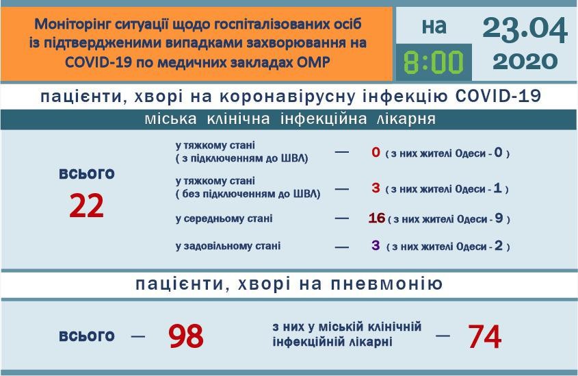 Из общего числа пациентов с COVID-19 в инфекционной больнице три человека находятся в тяжелом состоянии, при этом не нуждаются в проведении искусственной вентиляции легких. Все пациенты в возрасте старше 60 лет, из них один одессит, двое иногородних. Еще 16 пациентов находятся в состоянии средней тяжести (среди них ребенок в возрасте 1 год 3 месяца), трое — в удовлетворительном состоянии. Еще два ребенка 2007 и 2010 г.р. находятся в удовлетворительном состоянии дома на амбулаторном лечении.