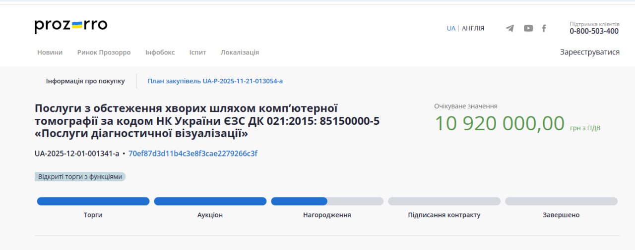Аукціон вже завершився. Заявка подана тільки діагностичним центром «Здоров’я», який погодився на 10 мільйонів 560 тисяч гривень.