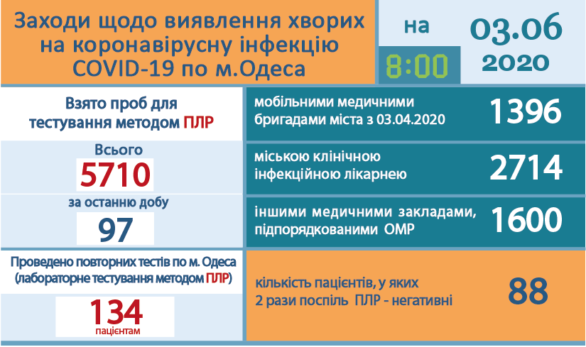 По данным на утро 3 июня, на стационарном лечении в городской клинической инфекционной больнице находятся 25 пациентов с лабораторно подтвержденным диагнозом COVID-19, все жители Одессы.