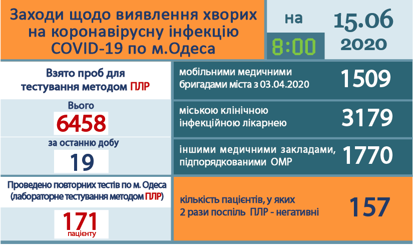 По информации Одесского областного лабораторного центра МОЗ Украины, на утро 15 июня 2020 года в Одесской области лабораторно подтвержден 1121 случай COVID-19. Из них 286 человек — жители Одессы. За последние сутки в регионе зарегистрированы 18 новых случаев заболевания, из них один — у одессита, 17 — у жителей районов области, передает пресс-служба мэрии.