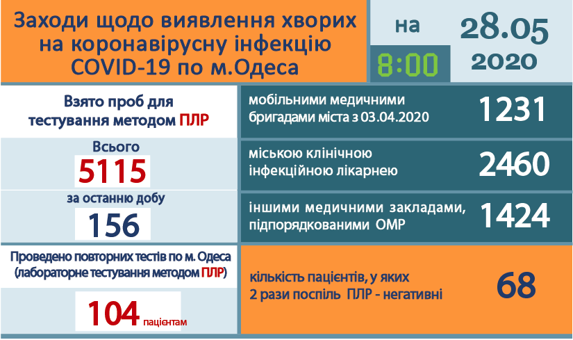 По информации Одесского областного лабораторного центра МОЗ Украины, на утро 28 мая 2020 года в Одесской области лабораторно подтвержден 861 случай COVID-19. Из них 210 человек — жители Одессы. За последние сутки в регионе зарегистрированы восемь новых случаев заболевания, из них пять — у одесситов и три — у жителей районов области, передает пресс-служба мэрии.