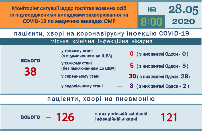 По данным на утро 28 мая, на стационарном лечении в городской клинической инфекционной больнице находятся 38 пациентов с лабораторно подтвержденным диагнозом COVID-19, из них 35 — жители Одессы.