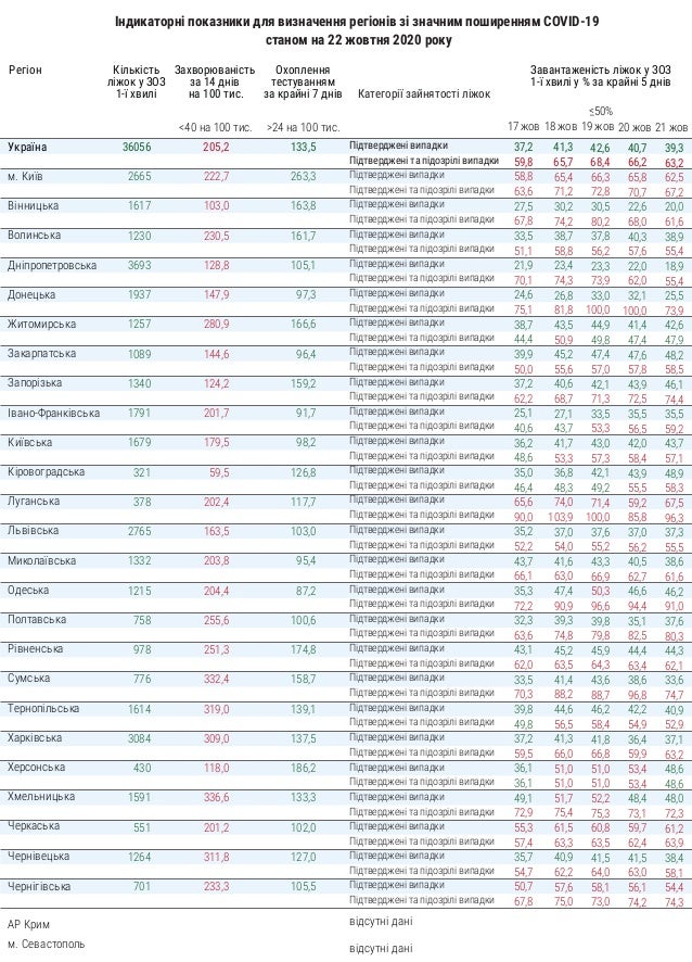 В то же время в стране ни одна из областей не соответствует требованиям для ослабления карантина. Во всех регионах превышен показатель заболеваемости. В среднем по стране этот показатель составляет 205,2 при норме в 40. Самая плохая ситуация в Хмельницкой области — 336,6. В Киеве показатель заболеваемости составляет 222,7.