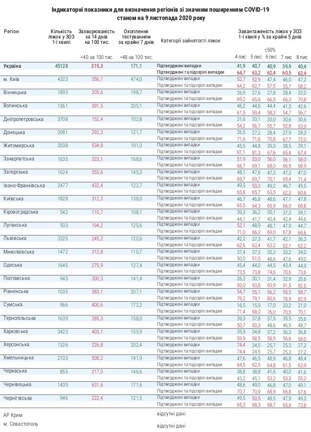 Самыми загруженными являются больницы Полтавской (92,5%), Ровенской (82,9%), Одесской (73,6%), Черниговской (73,8%), Донецкой (72%), Запорожской (71,4%), Винницкой (70,8%) и Сумской (70,1%) областях. В Киеве заняты 58,2% кроватей.