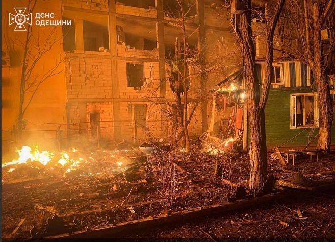 Також частково зруйнована розташована поруч чотирьохповерхова будівля та пошкоджений цивільний автомобіль.