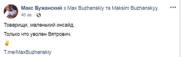 «Товарищи, маленький инсайд. Только что уволен Вятрович», — написал Бужанский.