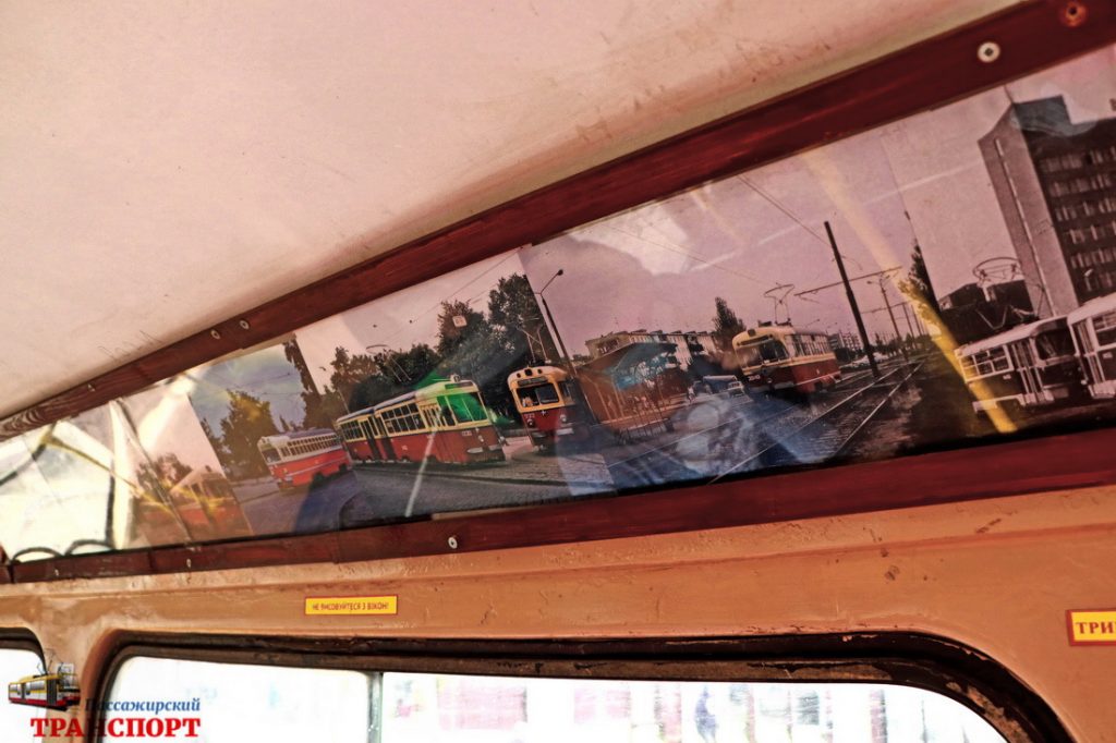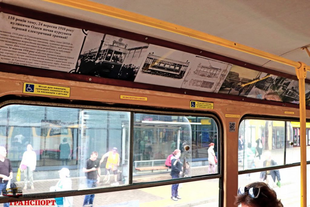 Трамвай снаружи отметили крупной надписью «Ювілейний вагон 110 років Одеському трамваю». А внутри — подготовленная заведующим музеем электротранспорта Максимом Коноваловым тематическая фотогалерея, повествующая об истории трамвайного движения в Одессе. Здесь есть фото самых первых «бельгийских» трамваев, в том числе и кадры с запуска первого «выставочного» маршрута ровно 110 лет назад.